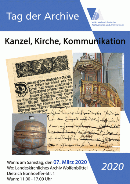 Am Samstag, 7. März, öffnet im Rahmen des bundesweiten Tags der Archive (Motto: „Kommunikation“) das Landeskirchliche Archiv, Dietrich-Bonhoeffer-Str. 1, Kirchencampus Wolfenbüttel, zwischen 11 und 17 Uhr seine Türen. Das Archiv bietet Besuchern die Gelegenheit, alle Aufgabenbereiche der Archivarbeit aus der Nähe kennen zu lernen und im Rahmen von regelmäßigen Führungen in die sonst nicht öffentlich zugänglichen Archivmagazine zu schauen. Das folgende Angebot können die Besucher wahrnehmen: